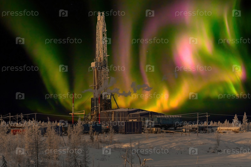 Зимний пейзаж полярной ночью с буровой установкой. Северное нефтегазовое месторождение. На заднем плане красивое небо с северным сиянием