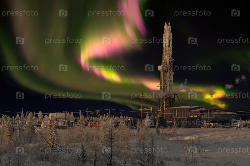 Зимний пейзаж полярной ночью с буровой установкой. Северное нефтегазовое месторождение. На заднем плане красивое небо с северным сиянием