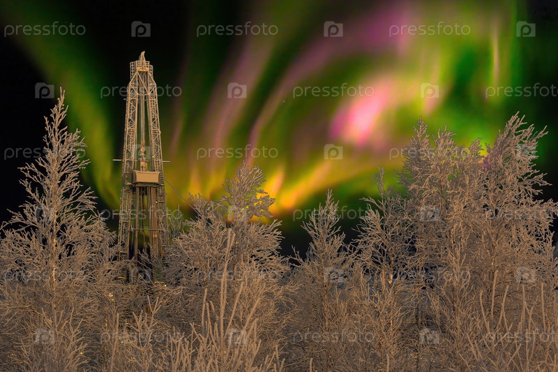 Полярная ночь. Зимний пейзаж с буровой установкой на северном месторождении нефти и газа. На заднем плане красивое небо с северным сиянием