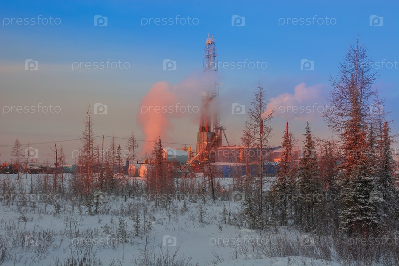 Буровая установка для бурения нефтяных и газовых скважин в северном ландшафте лесотундры. Восходящее зимнее солнце окрашивает пейзаж в оранжевый цвет. Клубы пара и дыма частично закрывают нефтяную вышку