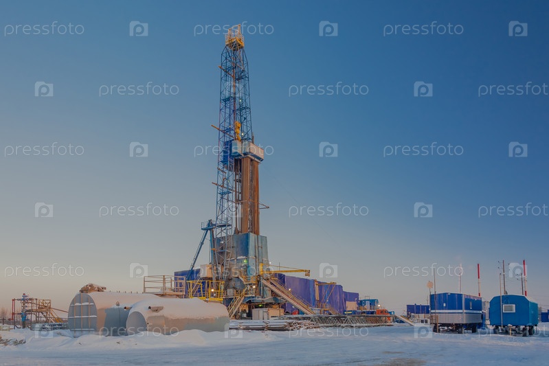 Общий вид конструкции буровой установки для бурения нефтяных и газовых скважин. Нефтяная вышка, оборудование и коммуникации. Бурильные трубы стоят вертикально
