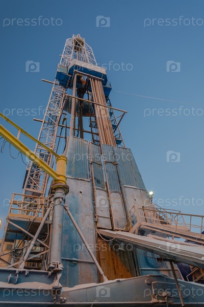 Буровая установка на северном нефтегазовом месторождении. Зимний полярный день. Оборудование и бурильные трубы покрыты снегом