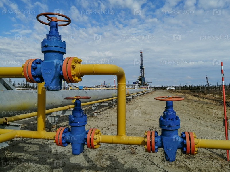 Трубопроводная арматура и манифольд добывающих газовых скважин на месторождении. Маховики для клапанов высокого давления. На заднем плане буровая установка. Размытие удаленных объектов