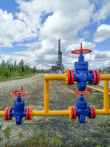 Трубопроводный коллектор газовых скважин добывающих газовых скважин Северного месторождения. Штурвалы задвижек высокого давления, трубопроводы. На заднем плане буровая установка. Размытие удаленных объектов
