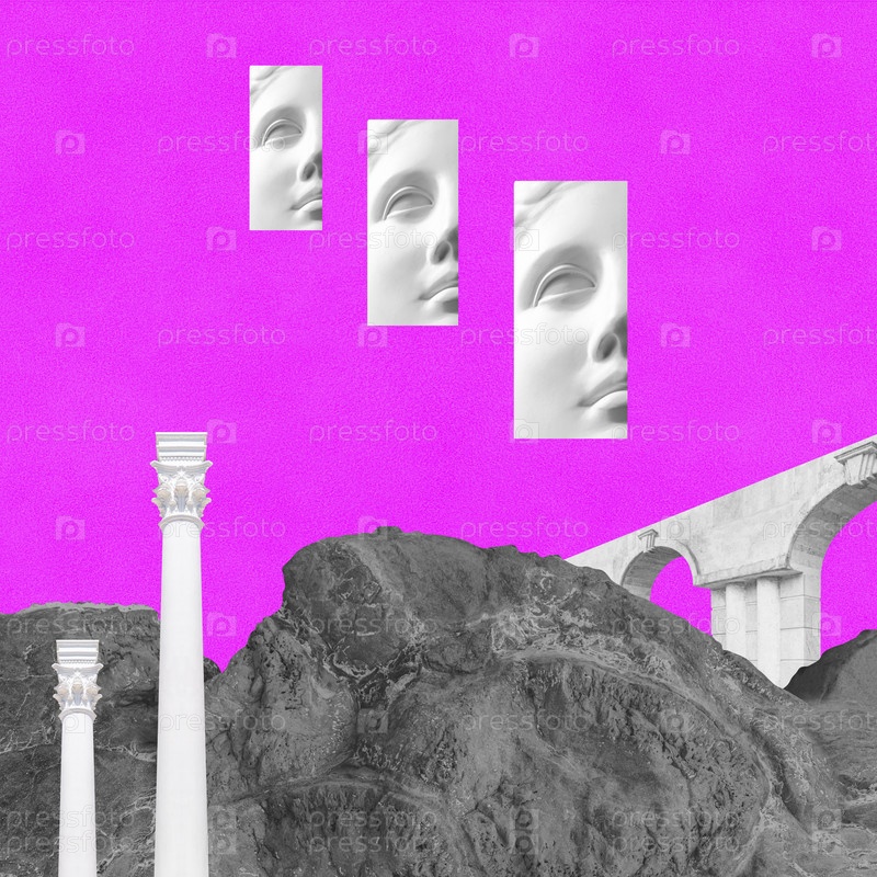 Сюрреалистический сумасшедший коллаж. Художественный постер, концепция, обложка журнала, необычный принт. Работа необычного абстрактного стиля