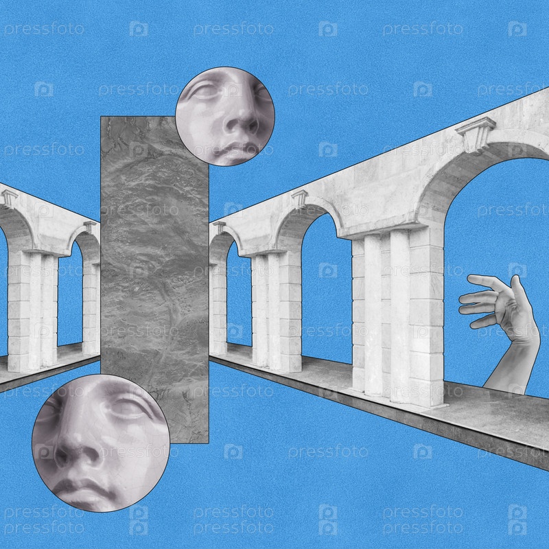 Сюрреалистический сумасшедший коллаж. Художественный постер, концепция, обложка журнала, необычный принт. Работа необычного абстрактного стиля