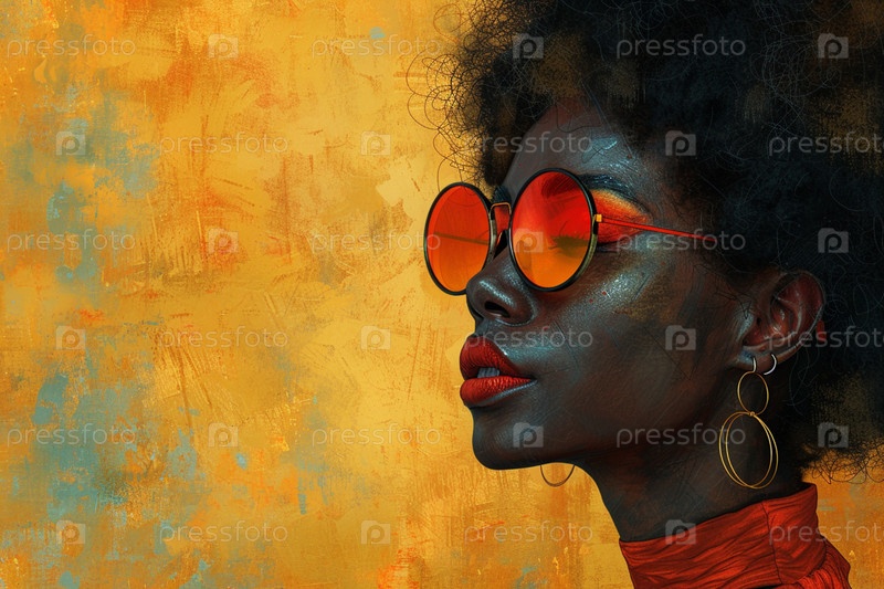 Афродевушка с короткой стрижкой и круглыми ретро-очками на фоне желтой стены в стиле иллюстраций