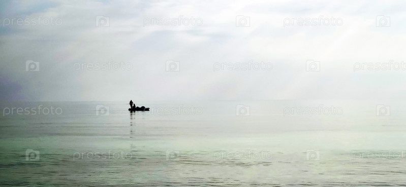 Снимок человека на небольшом катамаране у горизонта, который трудно обнаружить из-за тумана и влажности. На открытом воздухе