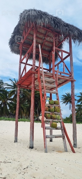 Кокосы на ступеньках сторожевой башни пляжа. Тропический