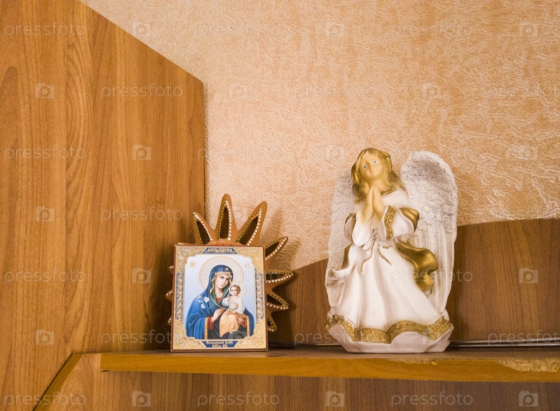 Концептуальный снимок фигурки и иконы маленького ангела. Религия
