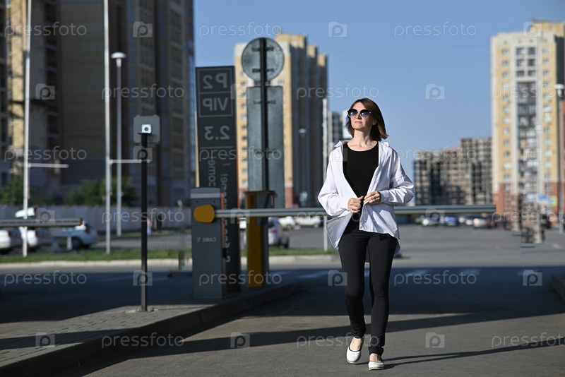 Уверенная в себе молодая девушка в белой футболке и солнцезащитных очках гуляет по улицам города, наслаждаясь летним днем. Уличная фотография