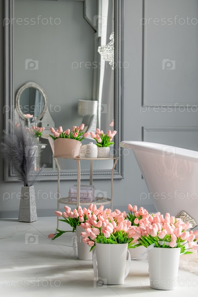 Ванная комната с большой белой ванной и несколькими розовыми цветами