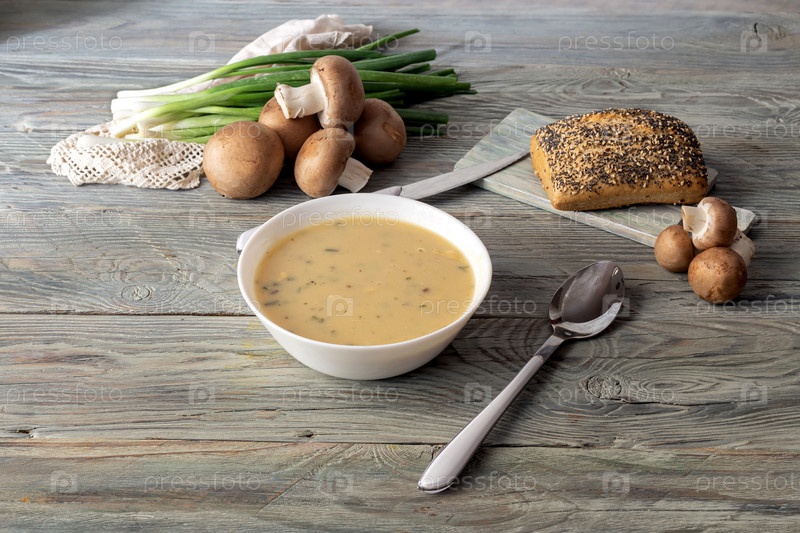 Грибной суп в белой миске крупным планом