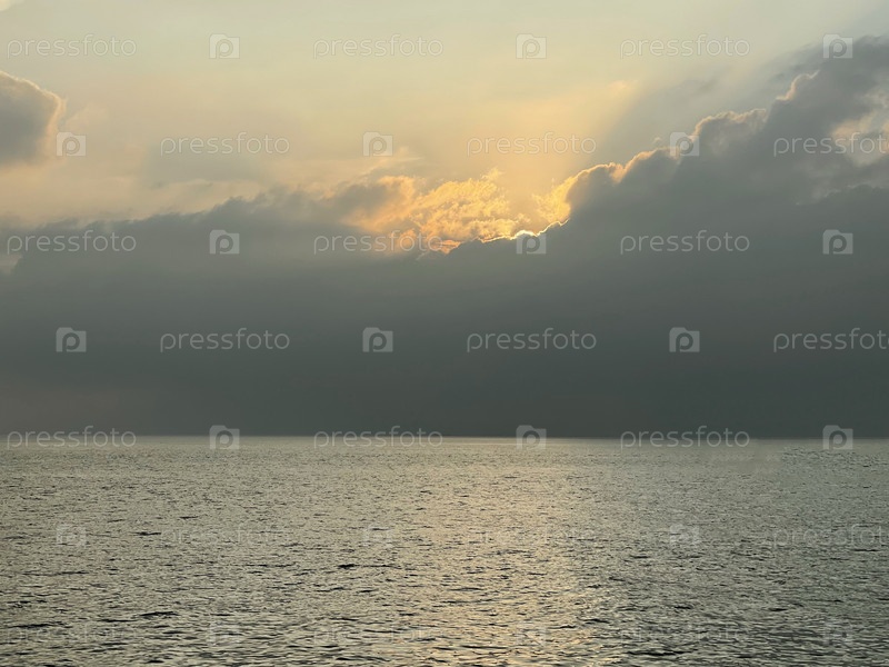 Красивый закат на море, солнце садится за большое облако, лежащее на воде