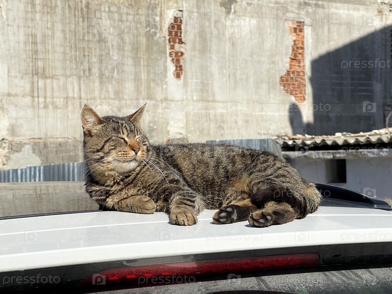 Кот лежит на крыше автомобиля и греется на солнце, Стамбул, Турция