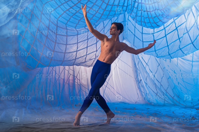 Мужчина в синем костюме танцует балет на синем фоне