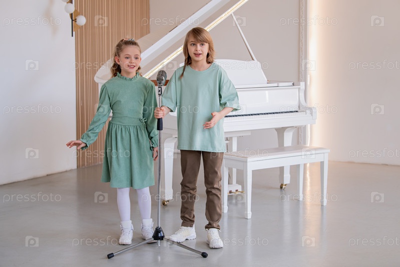 Двое детей поют перед микрофоном на фоне белого фортепиано. Сцена веселая и беззаботная