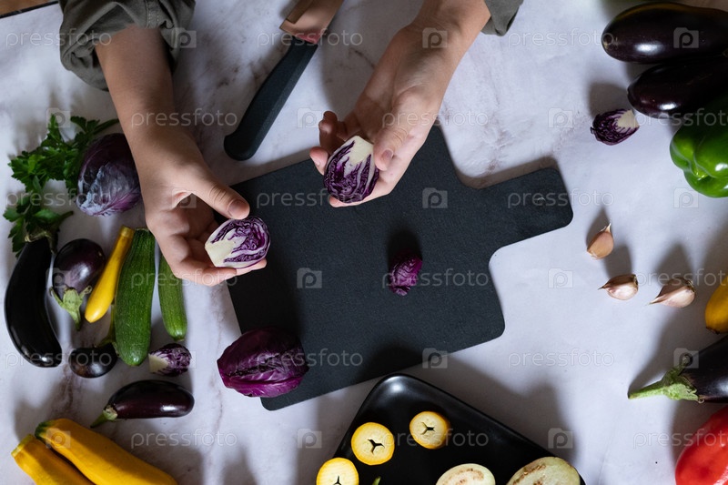 Женщина готовит свежий салат со спелой красной капустой за серым столом