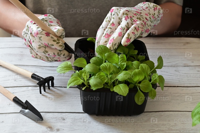 Женщина в садовых перчатках пересаживает цветок в горшок за деревянным столом, крупным планом