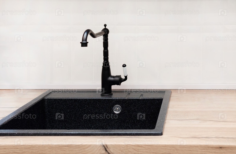 Детали кухонной раковины в фермерском доме с черным смесителем, фартуком из мозаичной плитки, мраморными столешницами и белыми шкафами