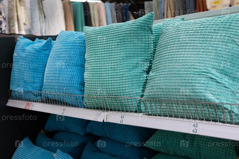 Разноцветная стопка банных полотенец. полотенца в стопке на полках в супермаркете. семейные покупки