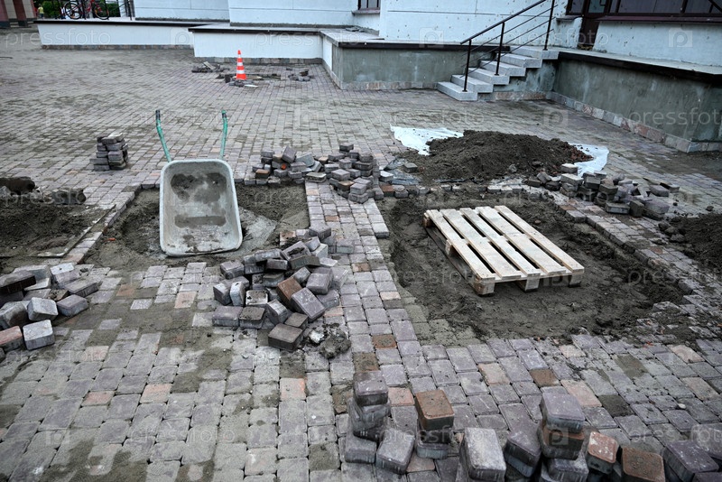 Низкий угол обзора мужских рук, измеряющих и выравнивающих песчаную и цементную плитку для точного покрытия наружного патио или тротуара. Строительная отрасль и ремонт