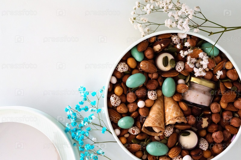 Арахис в коробке. Подарок к Женскому дню (8 марта), Женскому дню. День матери, День святого Валентина. Праздничная круглая коробочка