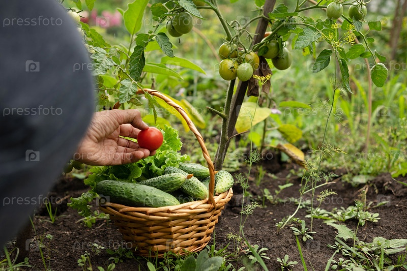 Крупным планом взрослый мужчина-фермер держит корзину со свежесобранными на данный момент овощами, довольными своим урожаем