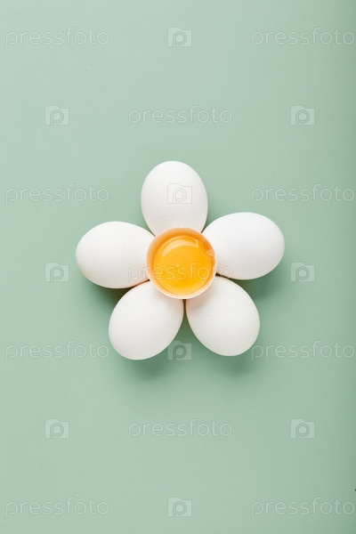 Крупный план цветка из яиц с желтым желтком в центре на зеленом фоне