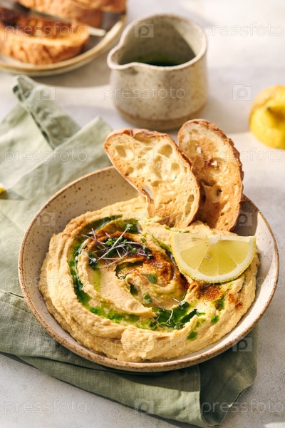 Вкусный домашний хумус с лимоном, паприкой, оливковым маслом и микрозеленью. Вегетарианское блюдо Ближнего Востока