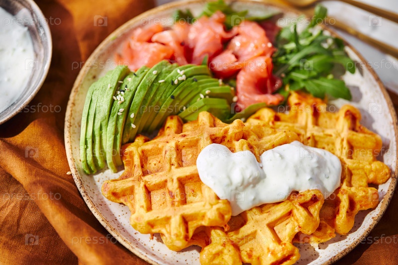 Сытные вафли из сладкого картофеля или тыквы с авокадо, лососем, рукколой и соусом