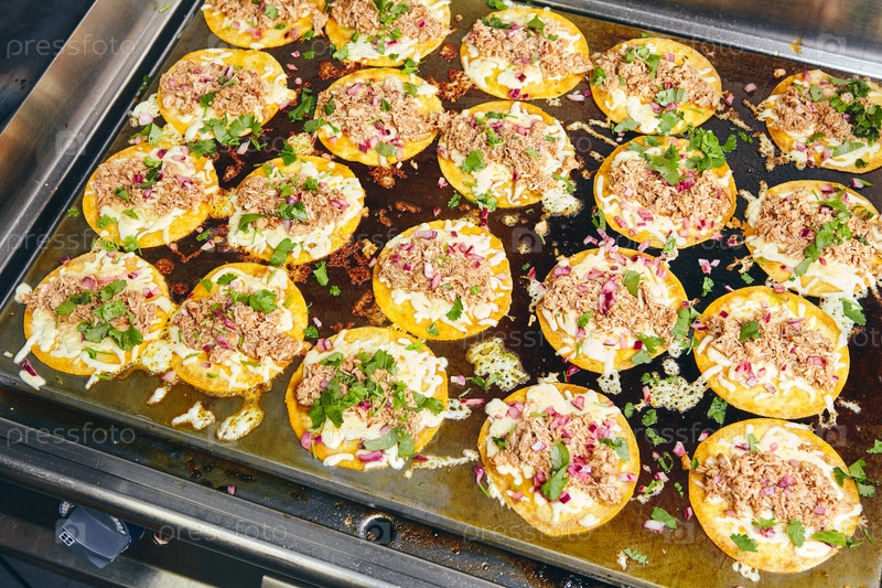 Жарить лепешки тако с сыром, луком, зеленью и мясом на сковородке на профессиональной кухне в ресторане. Мексиканская кухня, латиноамериканский фаст-фуд