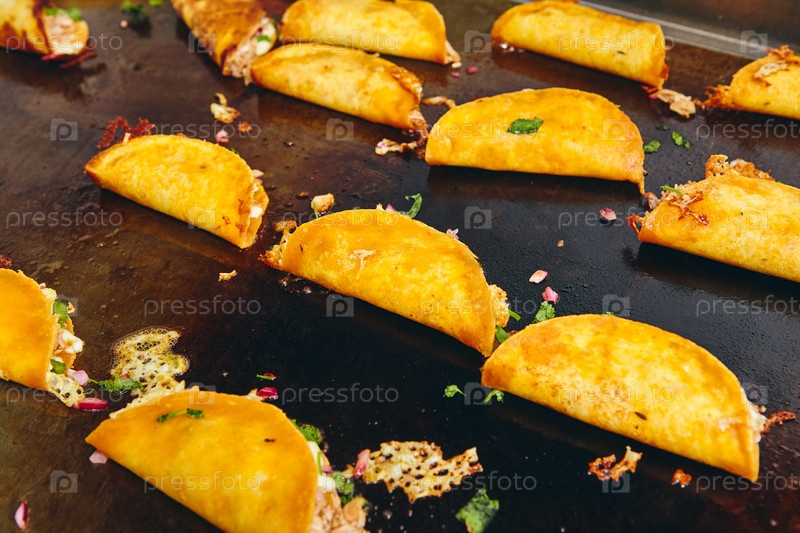 Жарить лепешки тако с сыром, луком, зеленью и мясом на сковородке на профессиональной кухне в ресторане. Мексиканская кухня, латиноамериканский фаст-фуд
