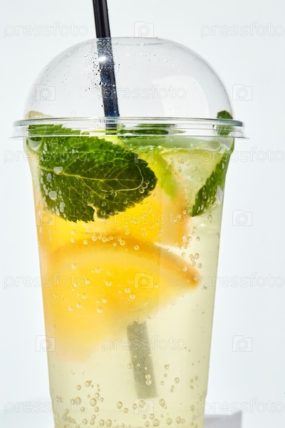 Лимонад с лимоном, апельсином, лаймом и мятой в прозрачном пластиковом стакане на белом фоне