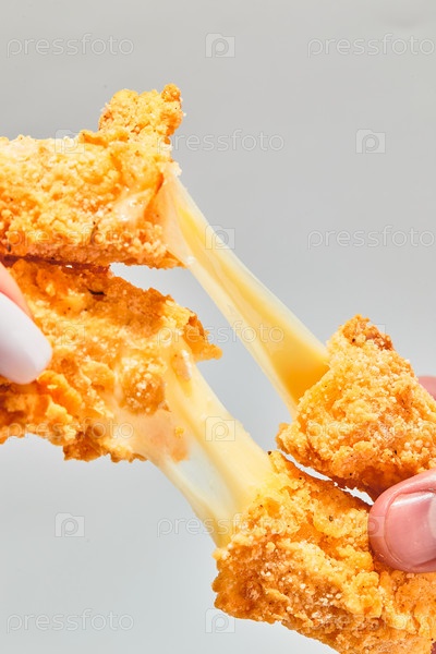 Хрустящие сырные палочки моцареллы, обжаренные в панировке, растягиваются двумя руками
