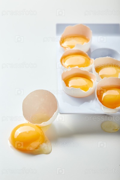 Подставка для шести разбитых яиц с целыми желтками. Одно яйцо лежит рядом, желток на столе