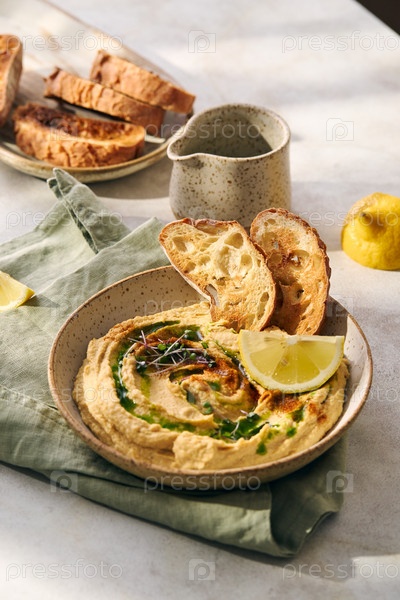 Вкусный домашний хумус с лимоном, паприкой, оливковым маслом и микрозеленью. Вегетарианское блюдо Ближнего Востока