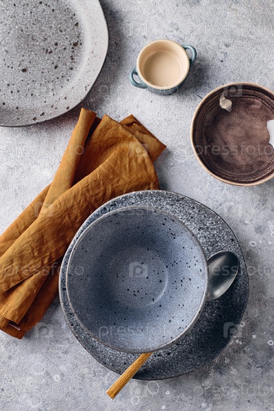 Набор посуды с ложкой и салфеткой. Сервировка стола проста и элегантна