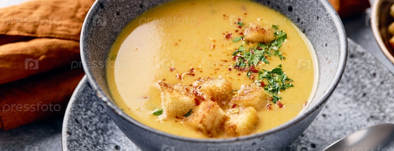 Чаша картофельного супа-пюре с ложкой на тарелке. Миска наполнена желтым супом-пюре и покрыта гренками, петрушкой и молотым красным перцем