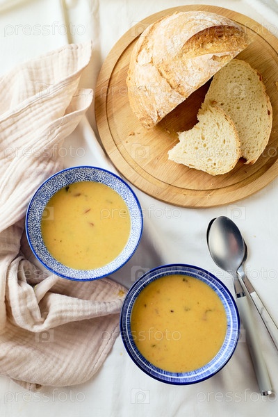 Две тарелки сливочного картофельного супа, ложки, салфетка и деревянная разделочная доска с буханкой хлеба и нарезанными кусочками