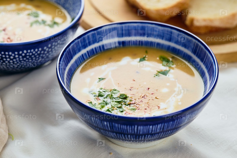 Две тарелки сливочного картофельного супа, ложки, салфетка и деревянная разделочная доска с буханкой хлеба и нарезанными кусочками. Поверхность супа украшают сливками, гренками, петрушкой и молотым красным перцем