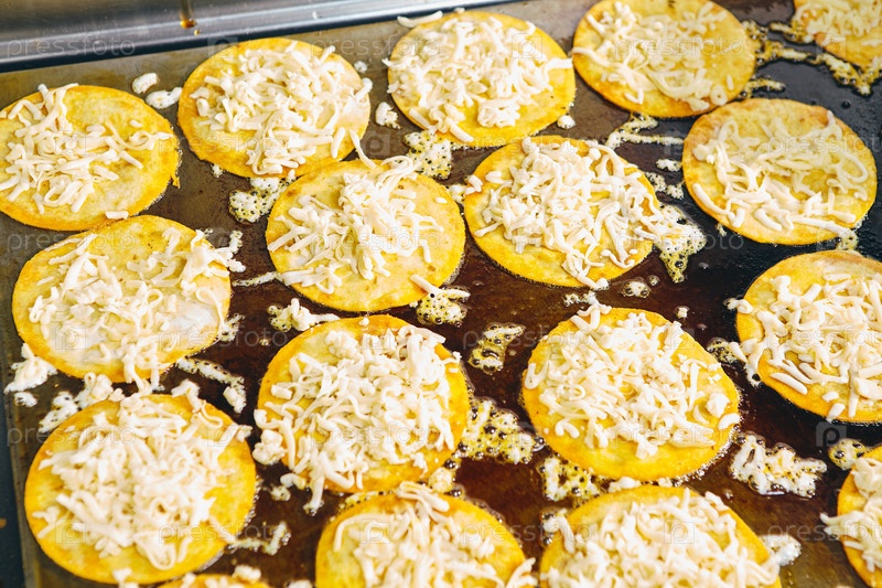 Жарить лепешки тако с сыром на сковородке на профессиональной кухне в ресторане. Мексиканская кухня, латиноамериканский фаст-фуд