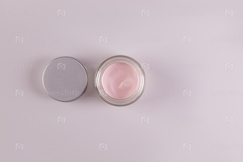 Косметическая баночка с натуральным кремом для ухода за собой на пастельном фоне. Вид сверху. Копировальное пространство. Натуральная косметика. упаковка. презентация. макет