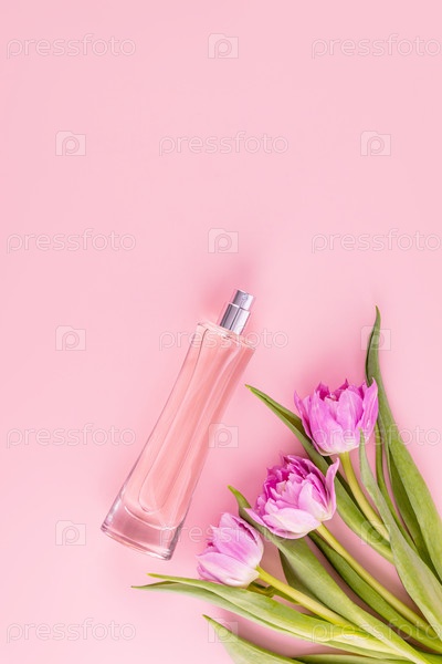 Роскошная стеклянная бутылка женских духов или косметического спрея на розовом фоне с весенними цветами. Концепция парфюмерии и красоты. Вертикальный вид