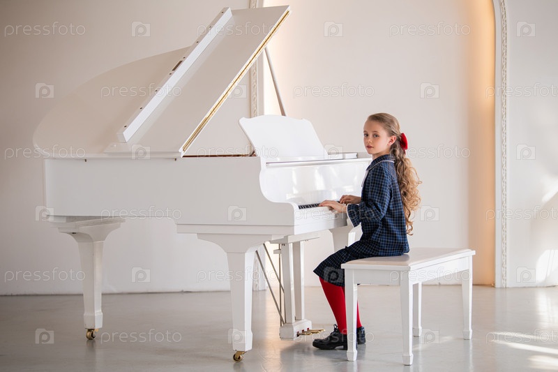 Девушка сидит за фортепиано и играет песню. Фортепиано белого цвета с черно-золотой отделкой. На девушке синее платье и красный бант. Сцена - одна из невиновности и радости