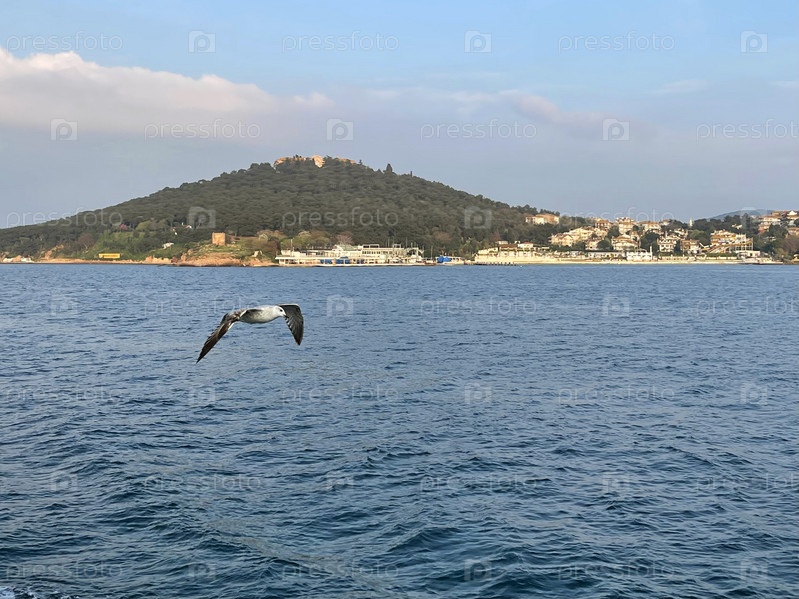 Чайка летит возле Принцевых островов на закате, Стамбул, Турция