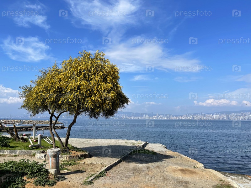 Желтое цветущее дерево на фоне Босфора и Стамбула