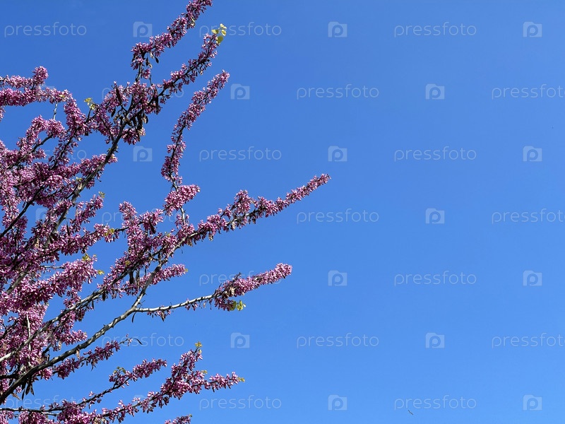Ветка розового цветущего дерева на фоне голубого неба
