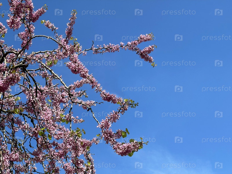Ветка розового цветущего дерева на фоне голубого неба