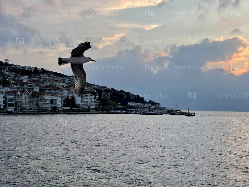 Чайка летит возле Принцевых островов на закате, Стамбул, Турция